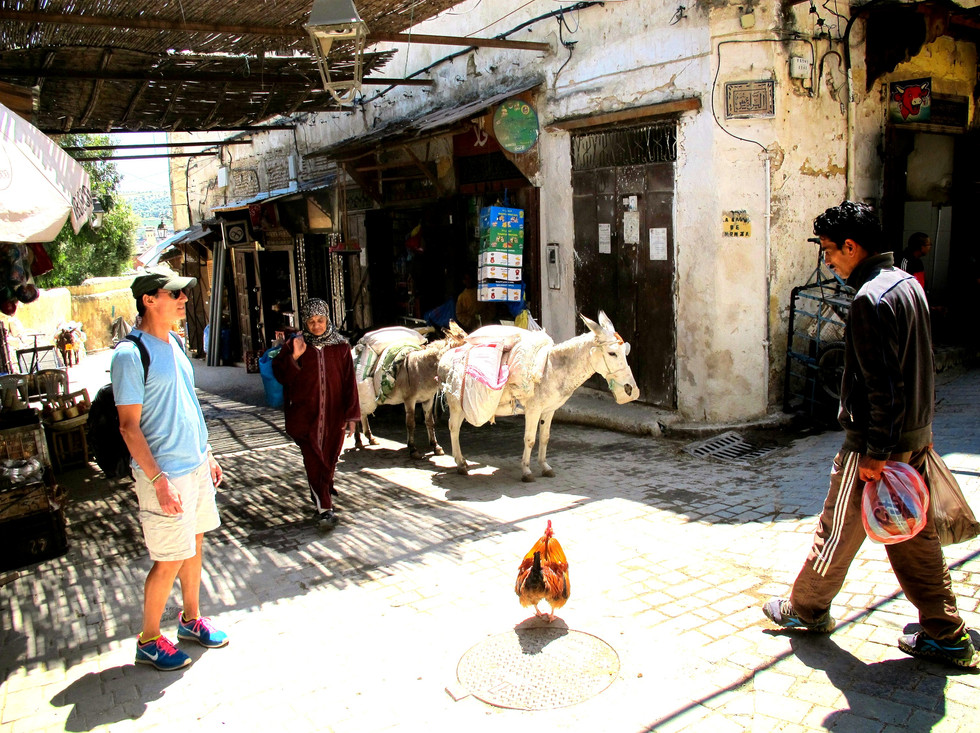 If we thought that Marrakech was a rabbit warren of alleys through the souk, or market, it was nothing compared to Fez! The second largest city in Morocco and a few centuries older than Marrakech, the old walled city transports you to another time. You forget that you live in the 21st century or even anything close to it. Our son Michael said he was glad we were going to Marrakech first because it would prepare us for the world of Fez, and he was right. We arrived at what appeared to be a huge parking lot at the end of a long drive from eastern Morocco. The central parking, it turned out, is a necessity. Porters were waiting to take us to our destination since the dirt alleys can't accommodate modern cars and no one could ever find anything within the walls anyway. We truly felt transported to another time.