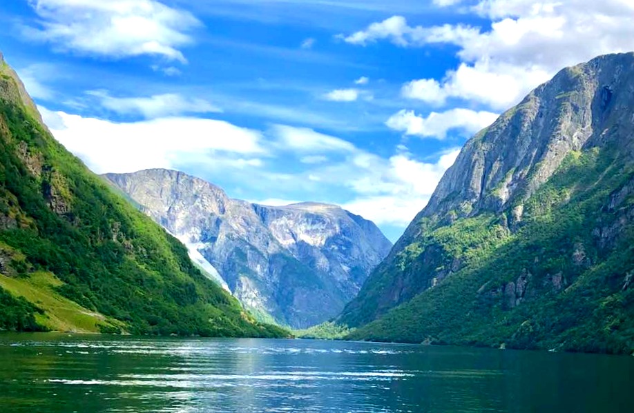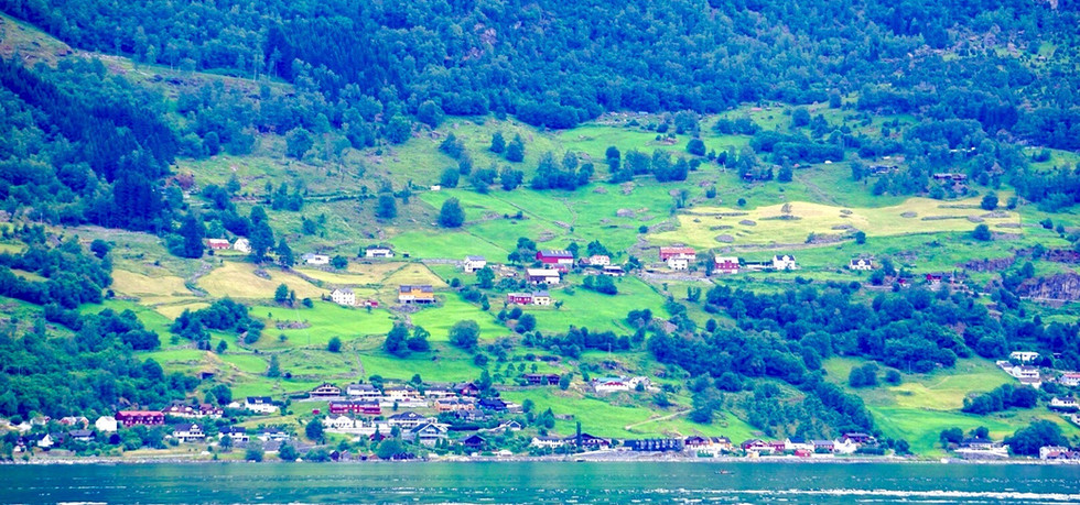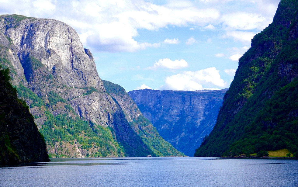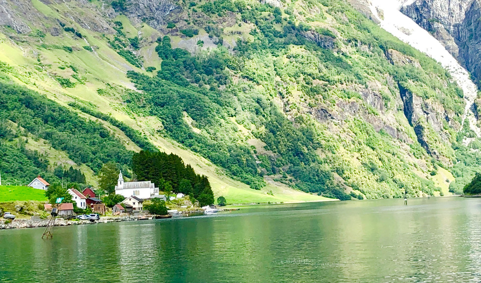 Once we were breathing again, we went to the bow of the boat for a bird's eye view of our new fjord (at that point we had no idea where we were or what fjord we were on). I don't know what the scenery at the Hardangerfjord would have been, but ours was stunning. It turns out that we were at the Nærøyfjord which is an arm of the "King", Sognefjord and is a UNESCO World Heritage site. Back home looking at a map, the crew member wasn't wrong; We were quite a distance from the Hardangerfjord!
