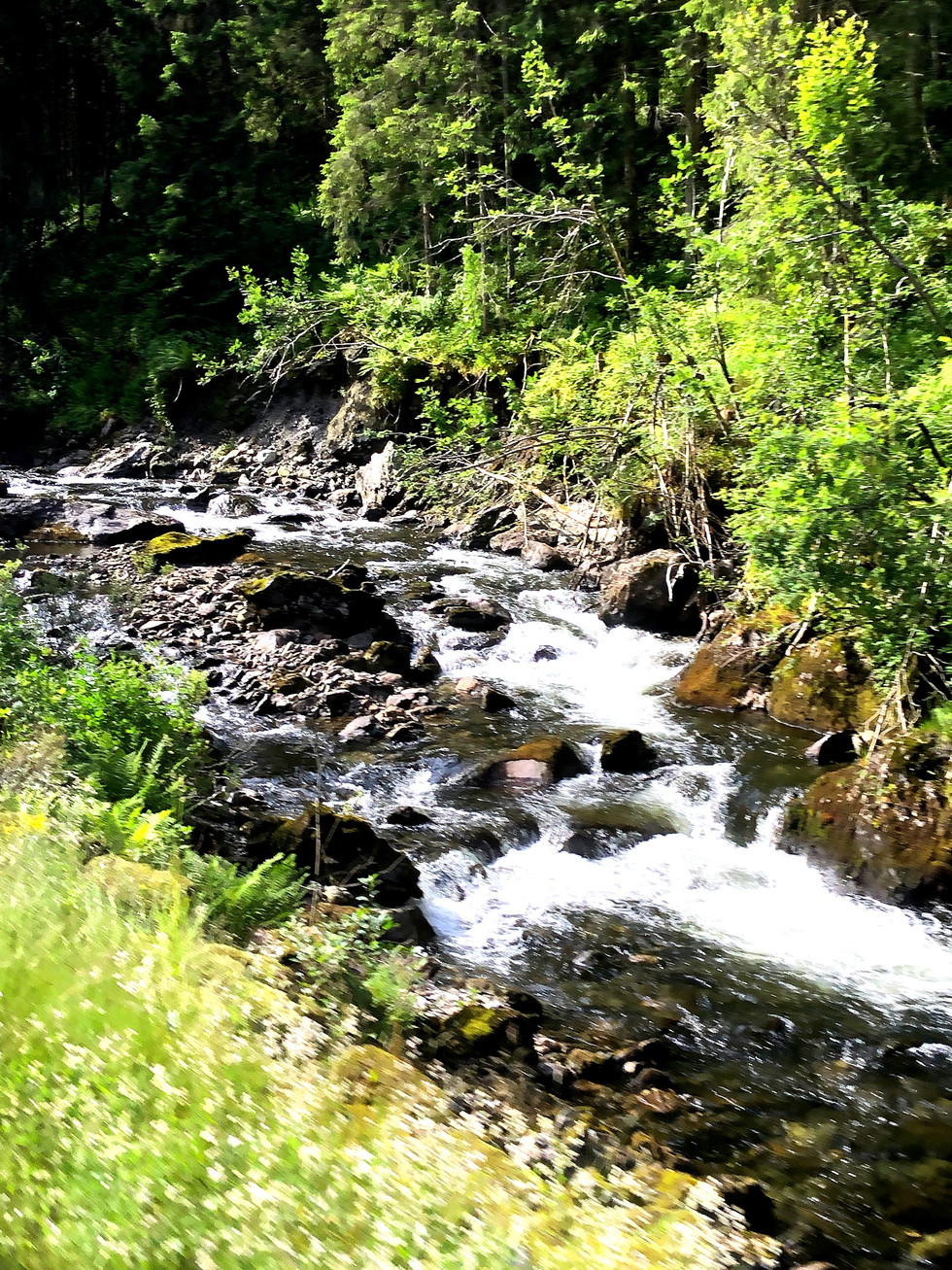 The train took us as promised to Voss where there was a parking lot full of waiting buses. We immediately boarded for our trip through the countryside to the boat that would take us through the Hardangerfjord. It was a lovely, winding route through the beautiful green hills.